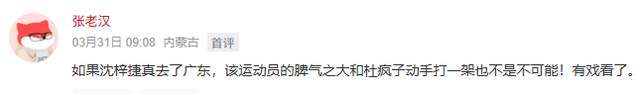 当然,这个赛季未能达成交易,并不意味着下个休赛期不能达成交易,一旦成行,就像球迷们所说的那样,“如果沈梓捷真去了广东,该运动员的脾气之大和杜疯子动手打一架也不是不可能!有戏看了。”