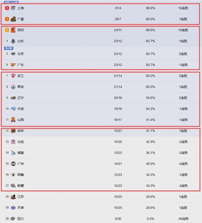 最后第三档球队分别为吉林、北控、广州、福建、南京、新疆,这6支球队均有机会去冲击季后赛附加赛最后一席。而江苏、天津和四川是第四档鱼腩球队,他们已经无缘季后赛。