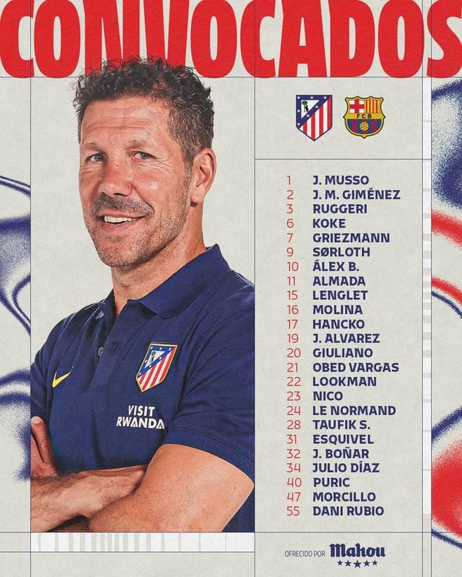 西甲第30轮焦点战,马竞主场迎战巴萨。赛前马竞官方公布了本场比赛的大名单:格列兹曼、阿尔瓦雷斯领衔;奥布拉克、略伦特、门多萨等多名球员缺席,多名青训小将入选。