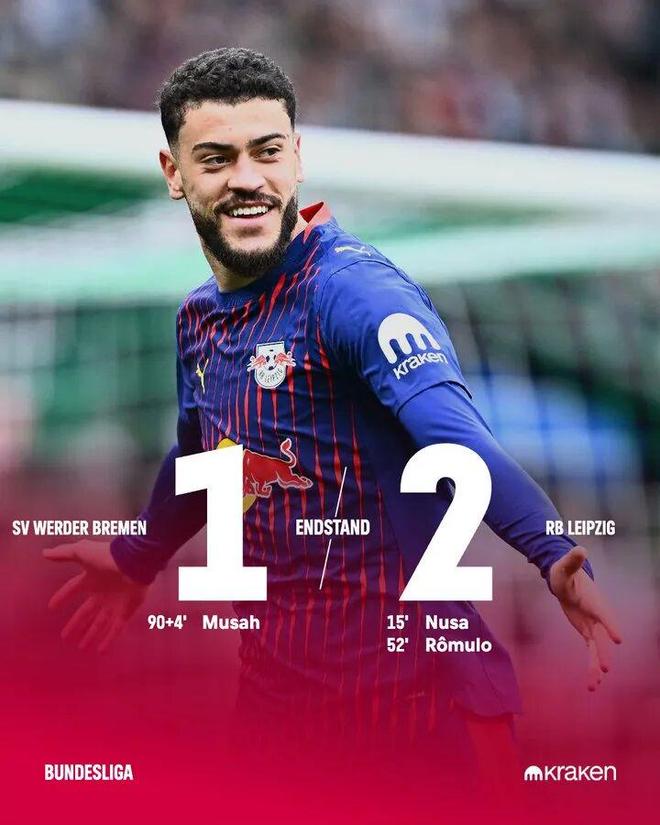 北京时间4月4日晚9点30分,云达不莱梅主场迎战RB莱比锡。上半场比赛,努萨禁区弧顶出低射打破僵局。易边再战,罗慕洛杀入禁区劲射再下一城,穆萨顶着两名防守队员低射扳回一城。最终,RB莱比锡客场2比1力克云达不莱梅,近5轮德甲比赛取得4胜。