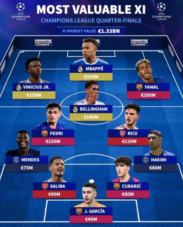 4月7日讯 《转会市场》也列出了八强最贵阵,巴萨、皇马、巴黎、阿森纳包揽。