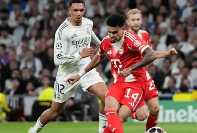 比赛第41分钟,皇马后场玩火,格纳布里断球直塞,迪亚斯单刀推射,1-0!下半场刚开始不到30秒,皇马防线又送礼,奥利塞横传,凯恩在弧顶处轰出一记贴地斩,皮球像长了眼睛一样钻入死角,2-0!这球一进,伯纳乌的心跳都停了半拍。