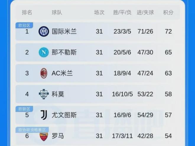 听起来不难?但看看接下来的赛程:乌迪内斯(客)、尤文图斯(主)、罗马(客)、佛罗伦萨(主)、热那亚(客)、拉齐奥(主)、卡利亚里(客)。其中与尤文、罗马的直接对话,每一场都价值6分。更严峻的竞争态势是:尤文图斯本轮2比0轻取热那亚,距离前四仅差1分;科莫稳居第四;亚特兰大和罗马同样虎视眈眈。