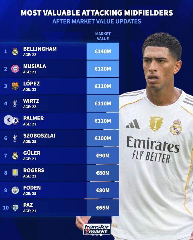 北京时间4月12日,德转列出了世界足坛前腰球员身价前10,皇家马德里的贝林厄姆以1.4亿欧元排名第一,拜仁慕尼黑的穆西亚拉以1.2亿欧元排名第二,费尔明-洛佩斯、维尔茨以及帕尔默三人同以1.1亿欧元并列第三位。